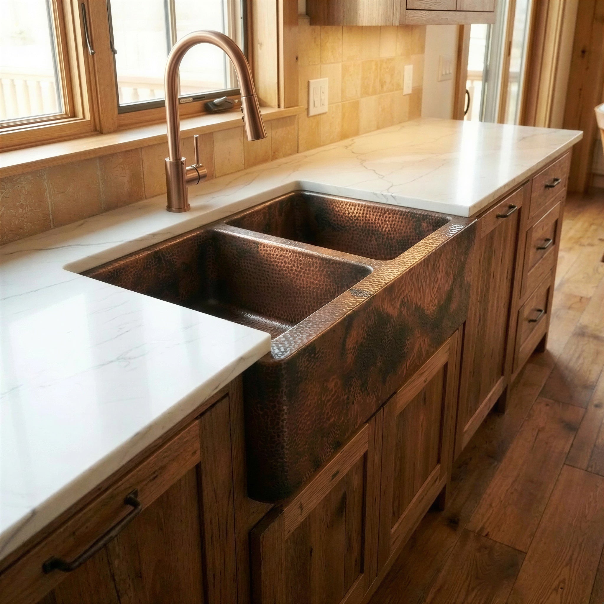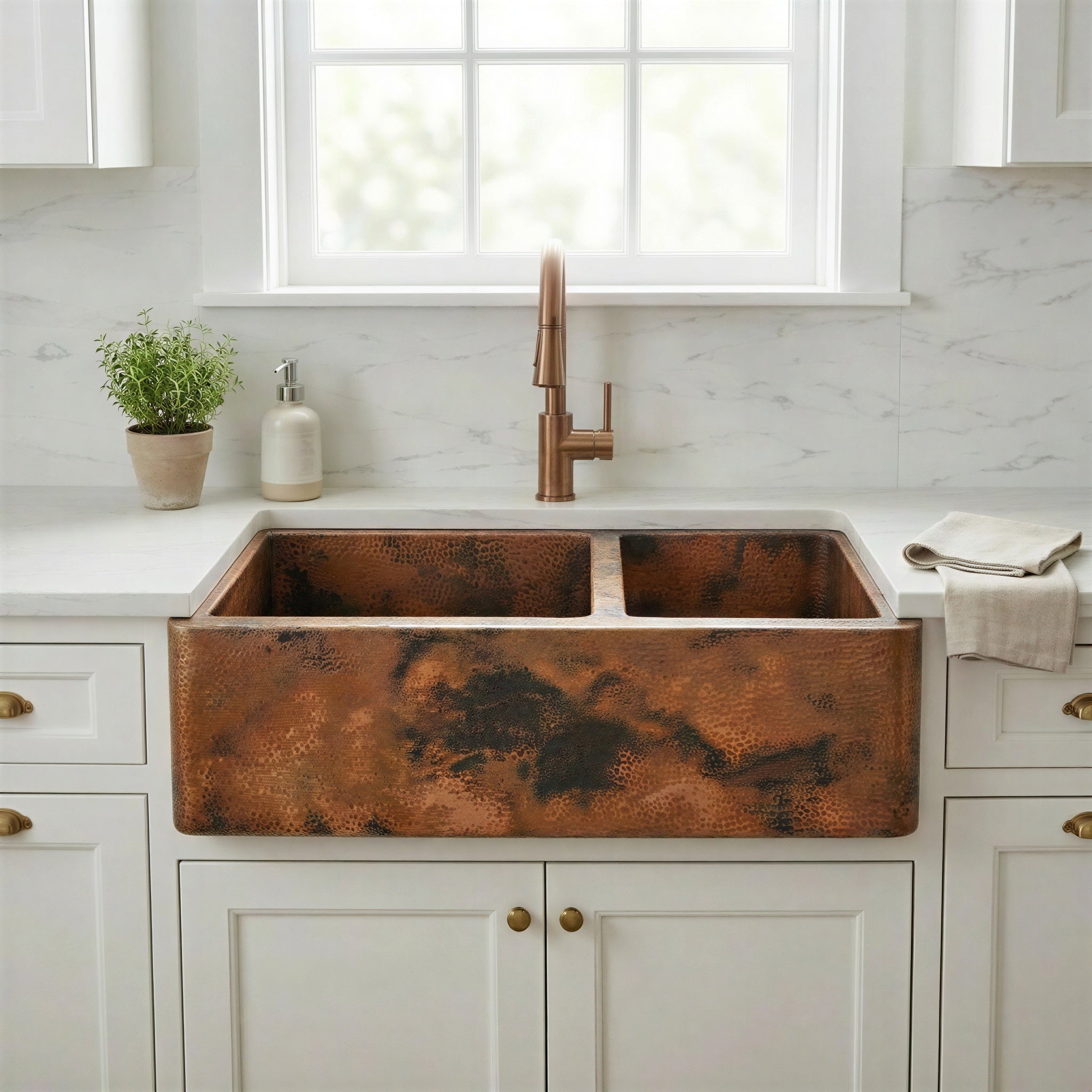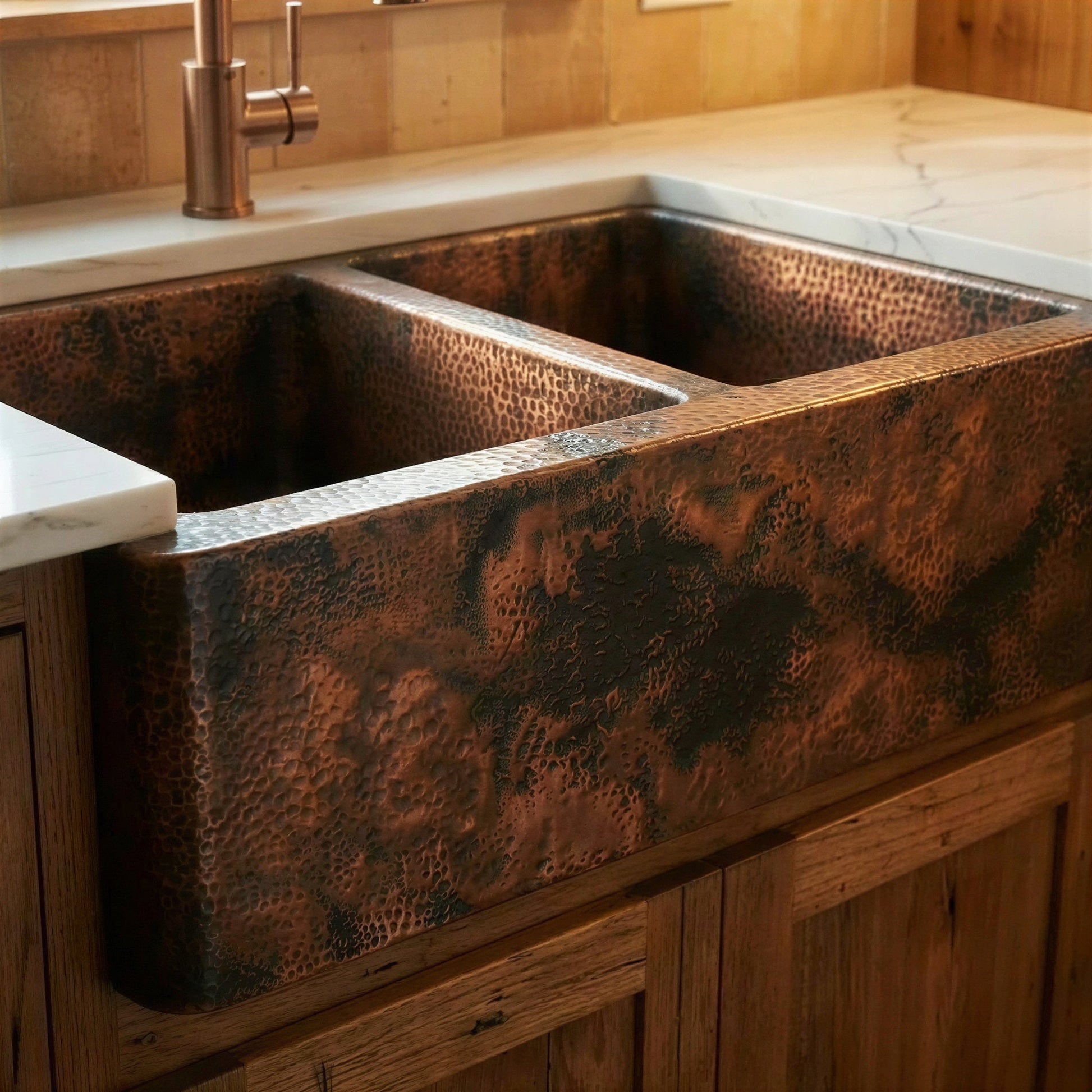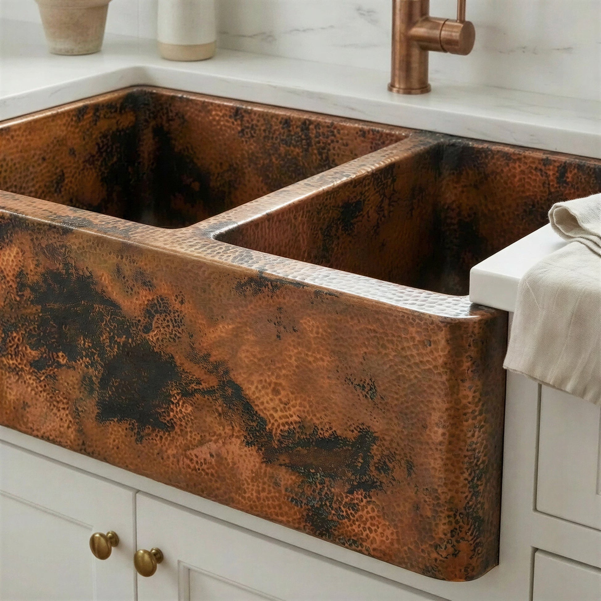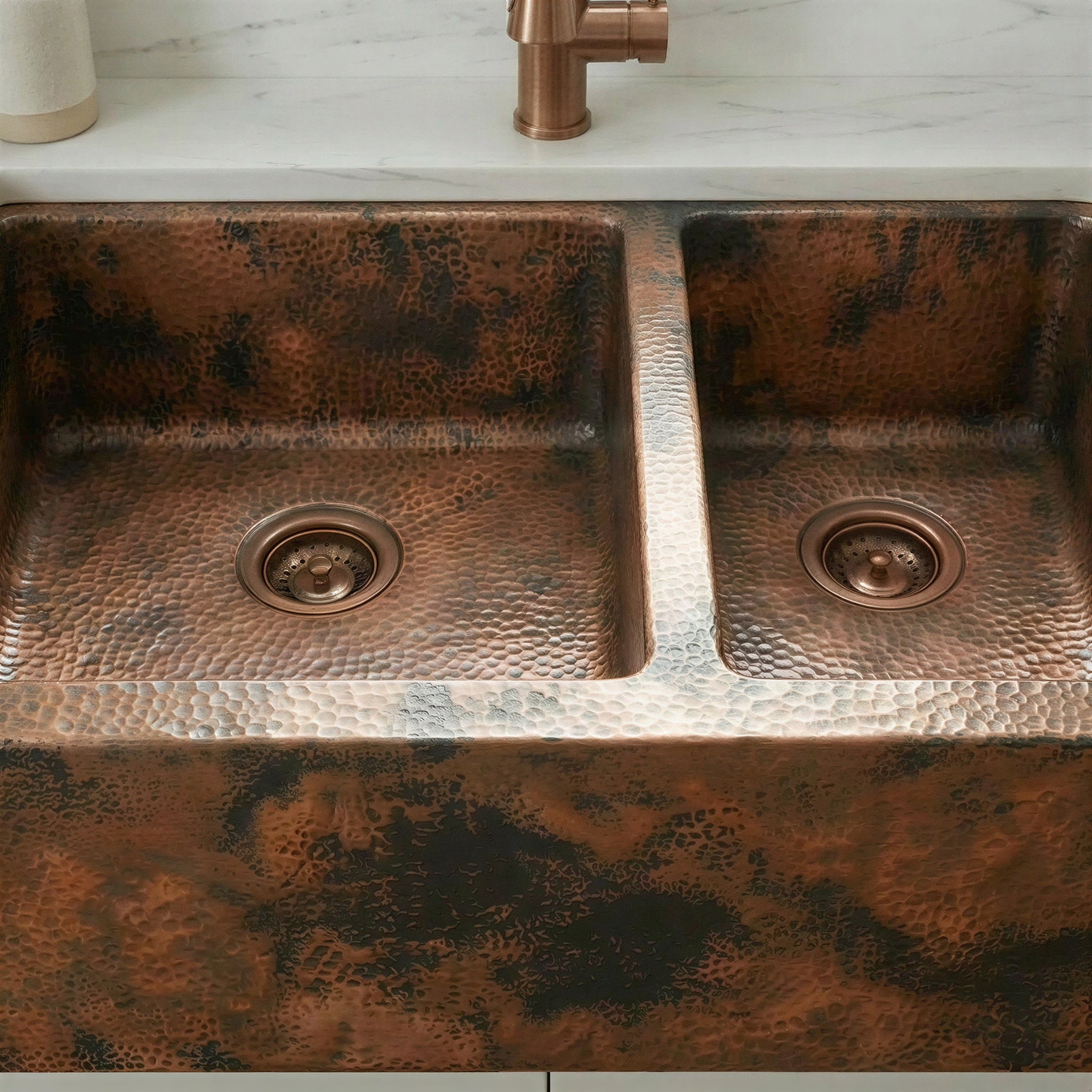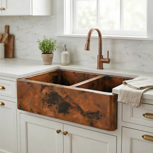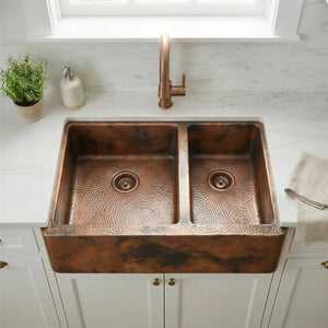 Double Bowl Copper Farmhouse Sink, Dual Basin Apron Front: Antique Copper Split Sink